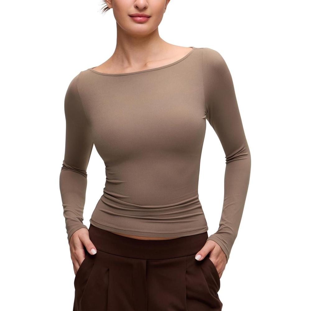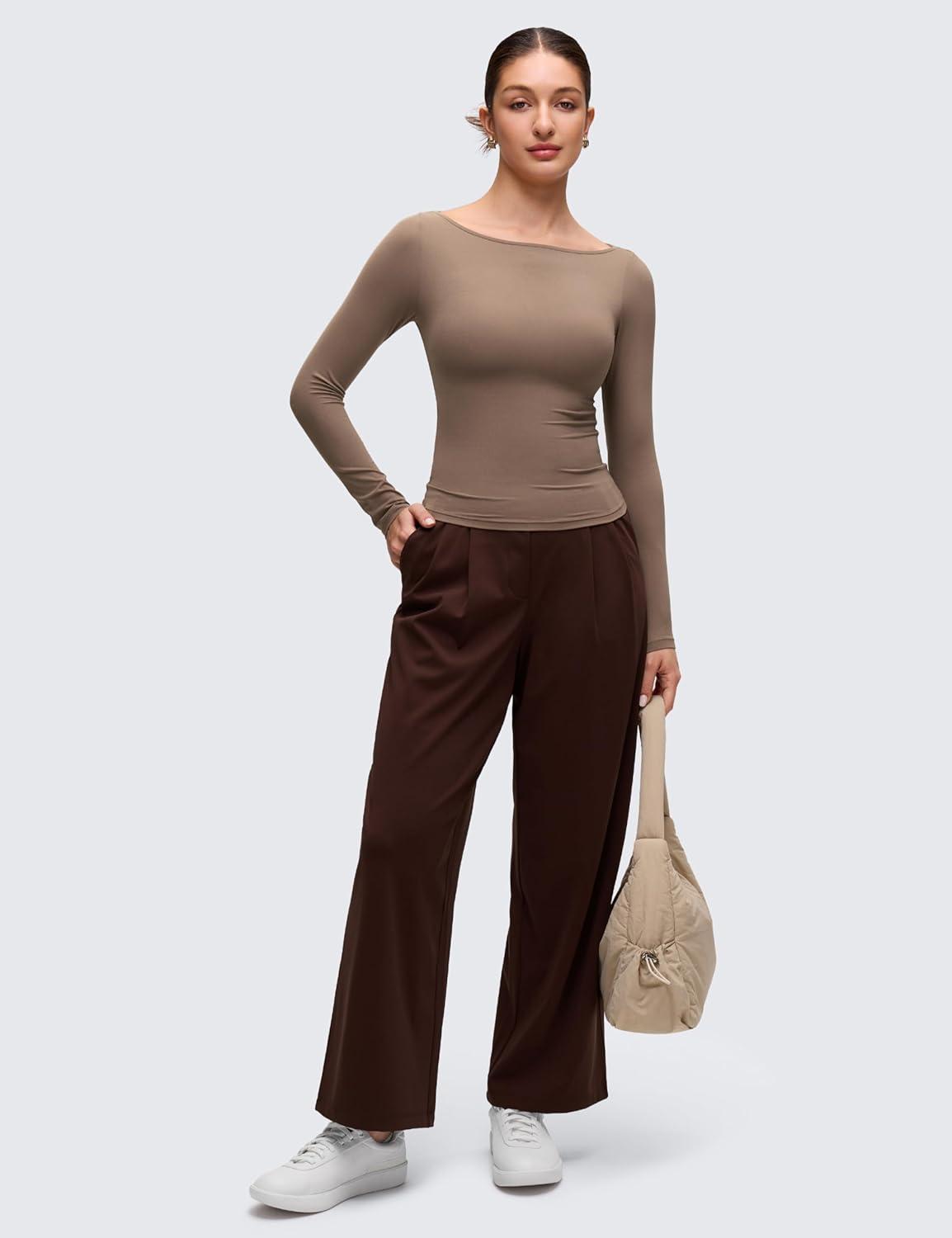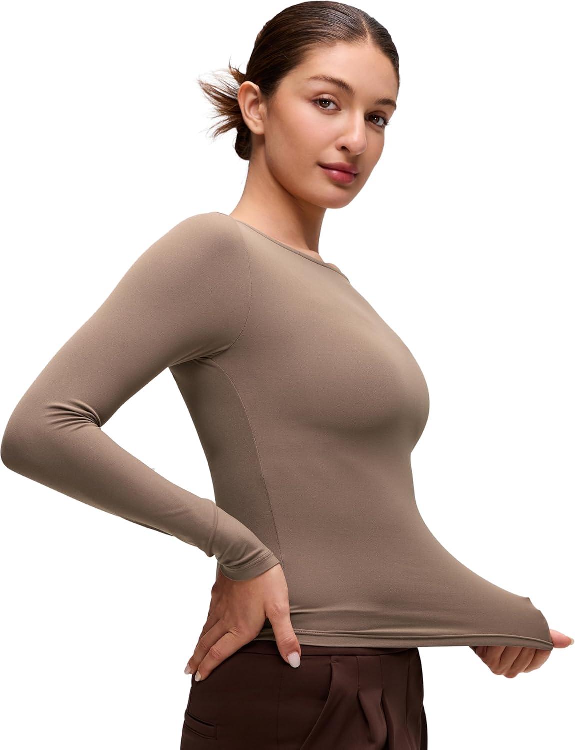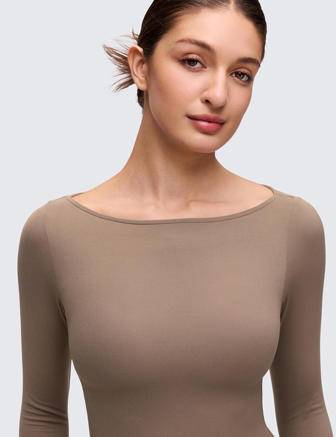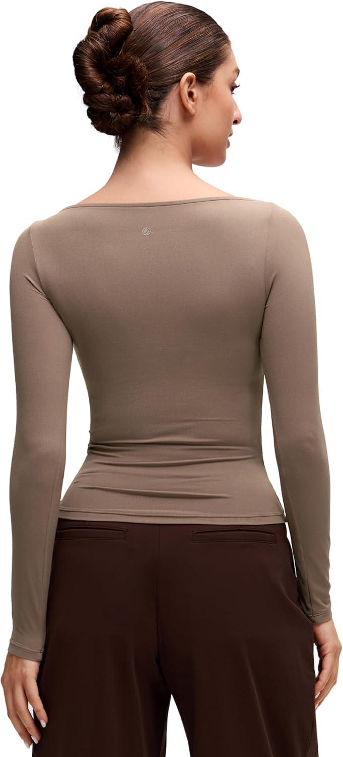 CRZ YOGA Softembrace Boat Neck Long Sleeve Shirts for Women – Casual Going Out Tops Soft Stretchy Fitted Fall T-Shirts(Brown Purple)