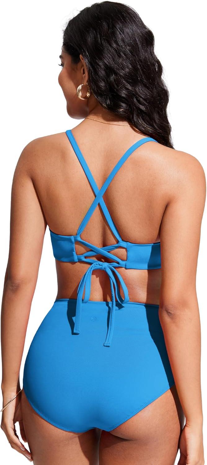 CRZ YOGA Tie Back Bikini Tops for Women – Padded Lace Up V Neck Swim Bathing Suit Bra(Madagascar Blue)
