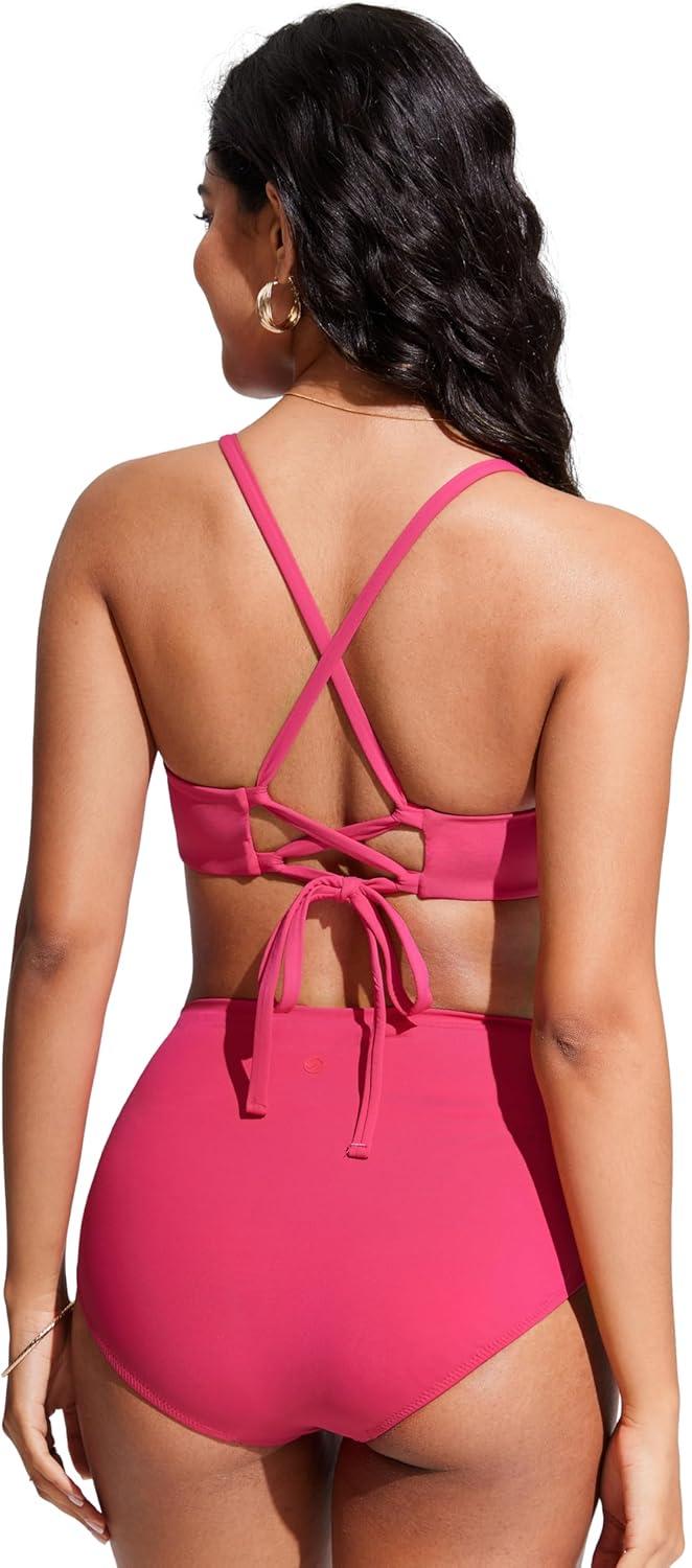 CRZ YOGA Tie Back Bikini Tops for Women – Padded Lace Up V Neck Swim Bathing Suit Bra(Magenta)