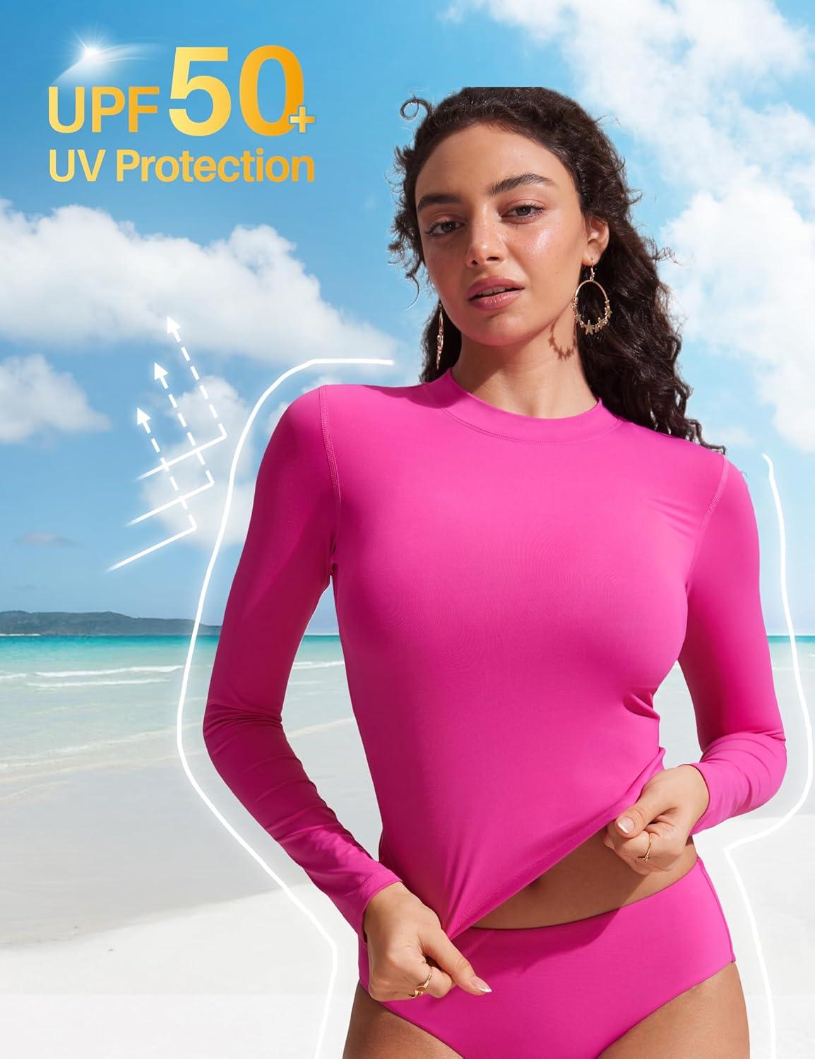 CRZ YOGA Women's sports swimsuits, the fabric is smooth, breathable and quick-dry, bringing you a comfortable sports experience. Cropped rash guard shirts design provide both great sun protection and chic style. Perfectly for swimming, beach, surfing, pool parties and water sports.